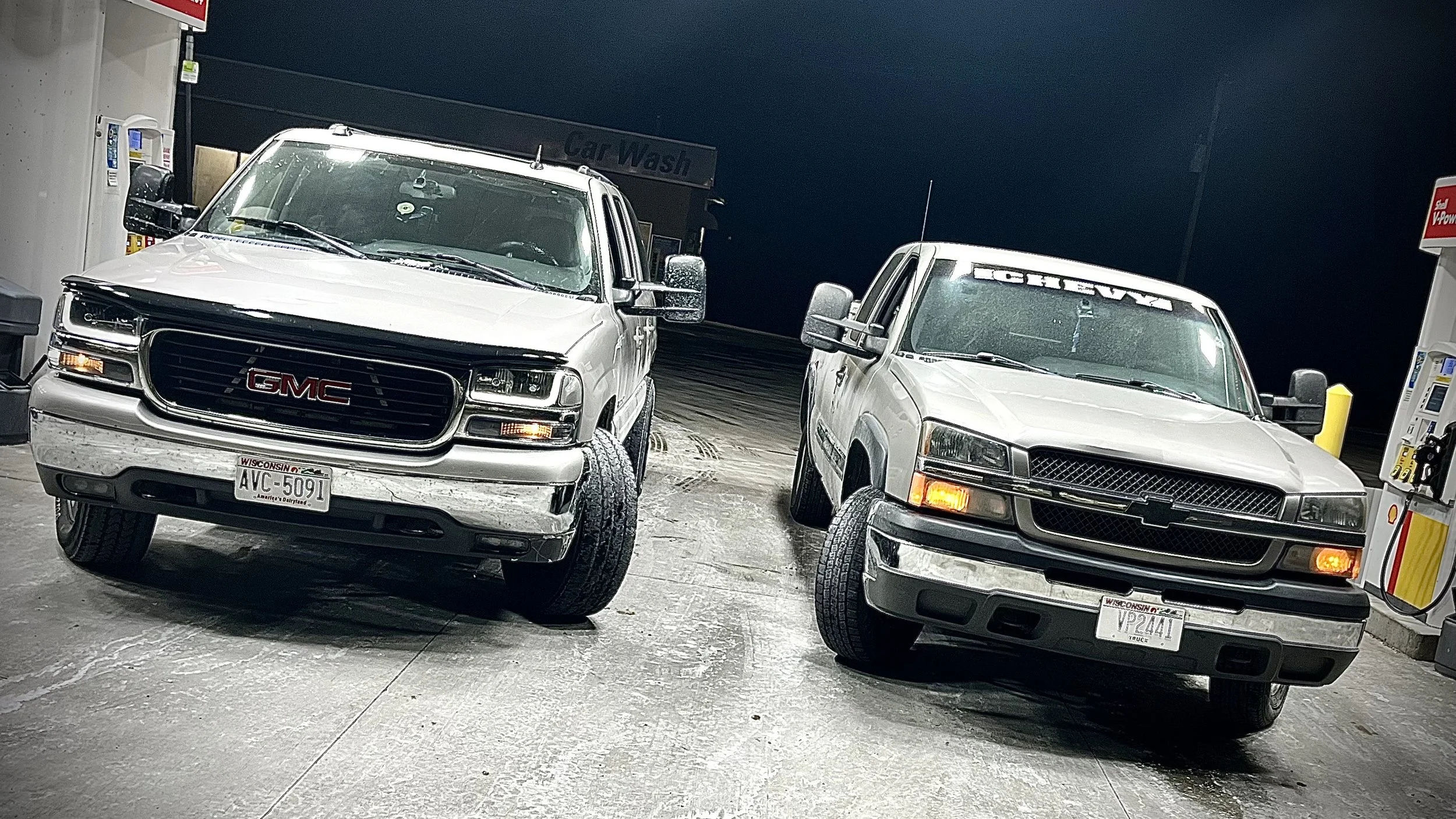 Two white pickup trucks parked at a gas station at night, with a car wash sign visible in the background and a fuel pump on the right.
