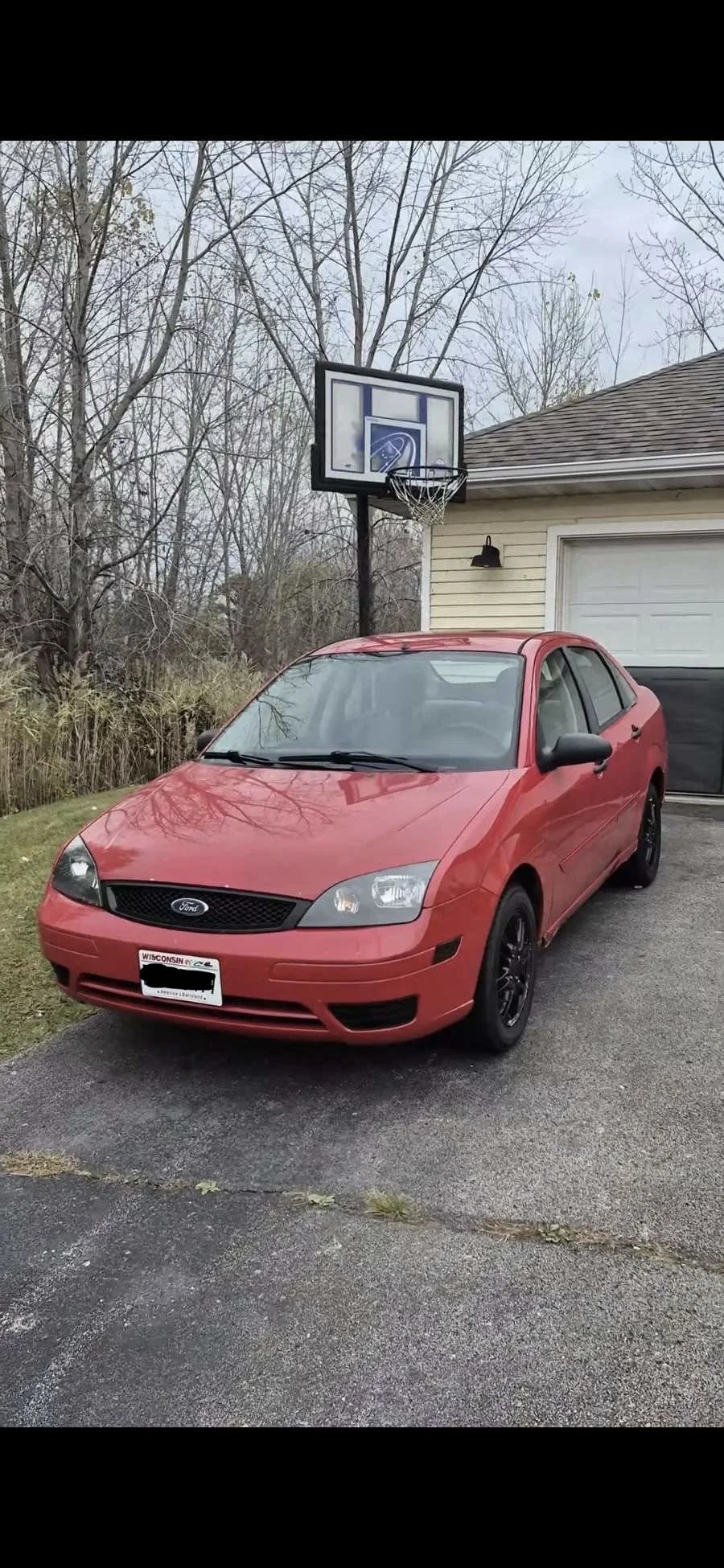 Red Ford sedan parked on driveway in front of a garage with a basketball hoop mounted above. The basketball backboard appears to display the NBA logo.